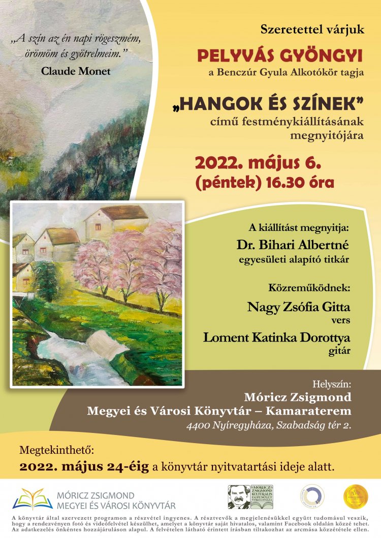 A Benczúr Gyula Alkotókör tagja, Pelyvás Gyöngyi mutatkozik be festményeivek a Móricz Zsigmond Megyei és Városi Könyvtárban, május 6-tól. A kiállítás május 24-ig látogatható.