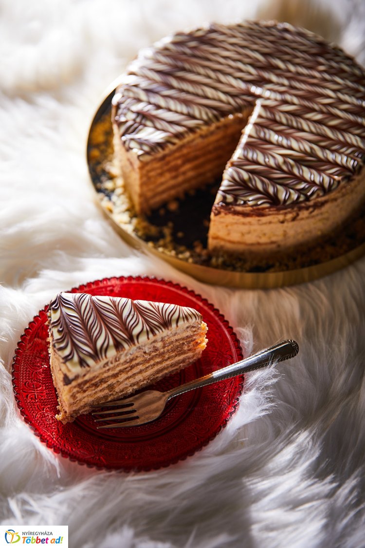 A krémmel rétegezzük a tortalapokat, körbekenjük vékonyan a szélét és a tetejét is a tortának és hűtőbe rakjuk kb. 1 órára. A fehércsokit és étcsokit külön-külön megolvasztjuk. A fehércsokit a torta tetejére csurgatjuk, elkenjük, az étcsokit nyomózsákba töltjük és pici lyukat vágunk a végén. Az étcsokit sűrűbb sávokban a fehércsokira csurgatjuk, majd egy fogpiszkálóval kb. 1 centinként az előző sávokra átlósan vonalakat húzogatunk, majd visszafelé is az 1 cm-es sávok között. Hűtőbe rakjuk, majd tálalásnál forró vízbe mártott késsel szeleteljük.