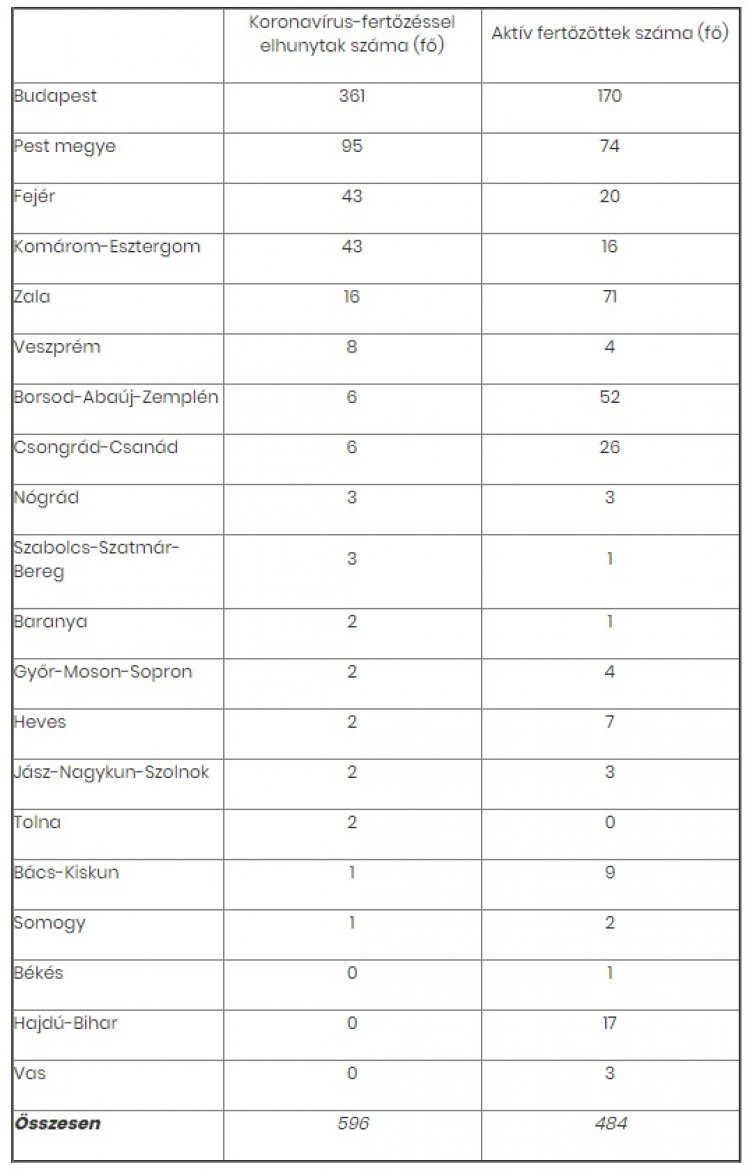 Az elhunytak döntő többsége olyan idős ember, aki több krónikus betegségben is szenvedett. 24 olyan elhunyt van, akinél jelenleg nem tudnak meglévő társbetegségről. Az elhunytak 60%-a (361 fő) budapesti, 40%-uk (235 fő) vidéki. Jelenleg három olyan megye van, ahol nem történt haláleset: Békés, Hajdú-Bihar és Vas. Az aktív fertőzöttek száma jelenleg 484 fő, 35%-uk budapesti, Tolna megyében nincs aktív fertőzött.