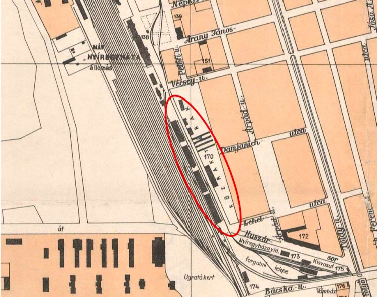 „a közraktár épülete a vasúti indóház melletti vendéglő kertjének keleti végében, a város tulajdonához tartozó területen, állíttatnék fel egyelőre 100 méter hosszúságban, mely épület összeköttetésbe hozatnék az államvaspálya síneivel”.