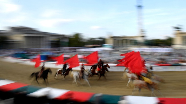 Lovasíjászok felvonulása a Nemzeti Vágta zárónapján (MTI Fotó: Kovács Tamás)