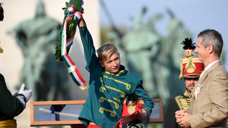 A sepsiszentgyörgyi Kolumbán Örs István, a Nemzeti Vágta kishuszár vágta versenyszámának győztese (MTI Fotó: Kovács Tamás)