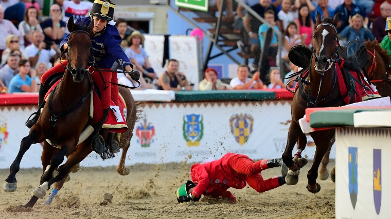 A zirci Molnár Gyöngyi leesik lováról a Nemzeti Vágta döntőjében (MTI Fotó: Kovács Tamás)