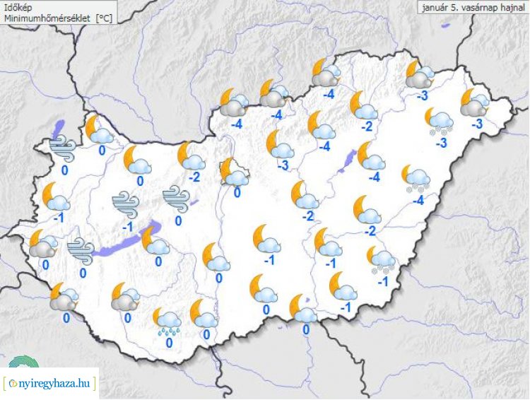 Az északnyugati, északi szelet nagy területen erős, főként a Dunántúlon viharos széllökések kísérik. A legalacsonyabb éjszakai hőmérséklet +1 és -5 fok között alakul.