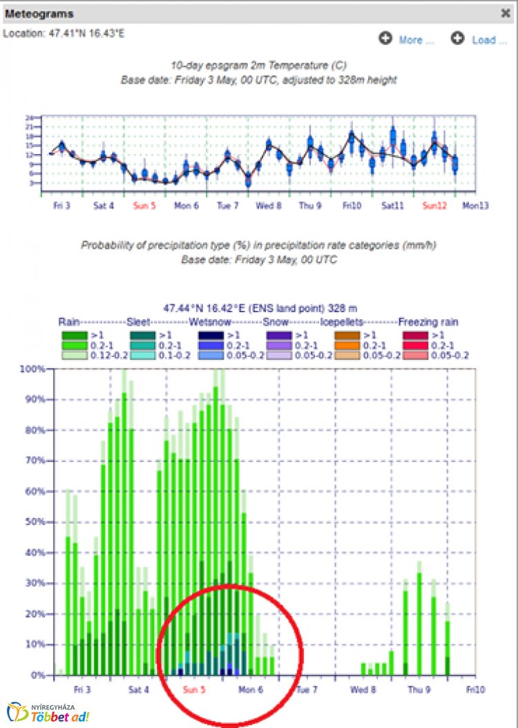 A csapadék mennyiségétől és halmazállapotától függően különböző színekkel vannak jelölve az oszlopdarabkák, ezek oszlanak el az egyes oszlopokban. Például a hétfő (május 6.) reggelen látszik, hogy a havas esőt és havat jelző oszlopdarabok összességében 10 százalék feletti esélyt adnak.