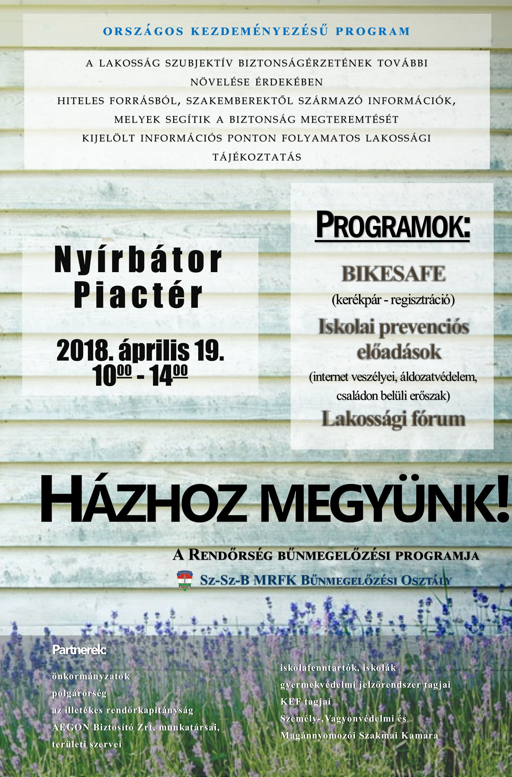 A rendőrség a másfél éve tartó „Házhoz megyünk!” elnevezésű országos kampánysorozatot idén is folytatja. A Szabolcs-Szatmár-Bereg Megyei Rendőr-főkapitányság Bűnmegelőzési Osztályának munkatársai a prevenciós programmal legközelebb 2018. április 19-én 10-14 óráig Nyírbátorban, a Piactéren várják az érdeklődőket. A szakemberek a program keretében tájékoztatást és ajánlásokat adnak vagyonvédelemről, az internet veszélyeiről, az áldozatvédelemről és a családon belüli erőszakról. Az országos kampánysorozat fő célja, hogy szakemberektől származó információk közreadásával a rendőrség segítse a közbiztonság növelését és javítsa az állampolgárok önvédelmi képességét. A megjelenteknek a helyszínen lehetőségük nyílik a „BikeSafe” program keretén belül kerékpárjaik ingyenes regisztrációjára.
