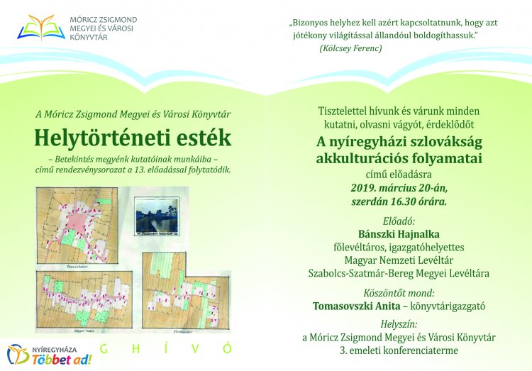 A rendezvénysorozat március 20-án, a 13. előadással folytatódik a Móricz Zsigmond könyvtárban. Az összejövetelen A nyíregyházi szlovákság akkulturációs folyamatai címmel Bánszki Hajnalka tart előadást.