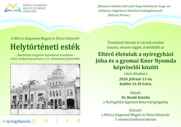 Február 11-én a 22. előadással folytatódik a Helytörténeti esték rendezvénysorozat, a Móricz Zsigmond könyvtárban. Ez alkalommal dr. Bordé Katalin, a Nyíregyházi Egyetem könyvtárigazgatójának előadása várja az érdeklődőket.