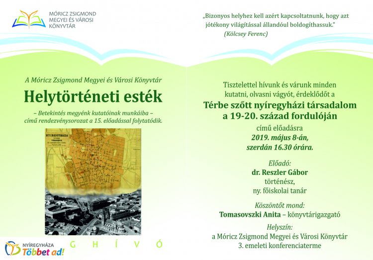 Dr. Reszler Gábor történész előadásával folytatódik a Helytörténeti esték rendezvénysorozat, május 8-án.