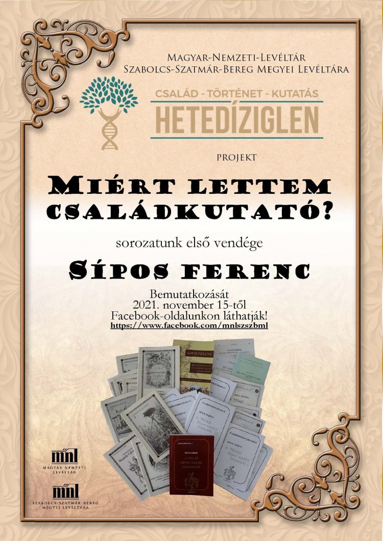 A Szabolcs-Szatmár-Bereg Megyei Levéltár Hetedíziglen projektjében induló új sorozatában olyan családkutatókat ismerhetnek meg az érdeklődők, akik régóta foglalkoznak az ősök feltárásával. A sorozat első vendége Sípos Ferenc, akinek bemutatkozása november 15-től az intézmény Facebook-oldalán érhető el.
