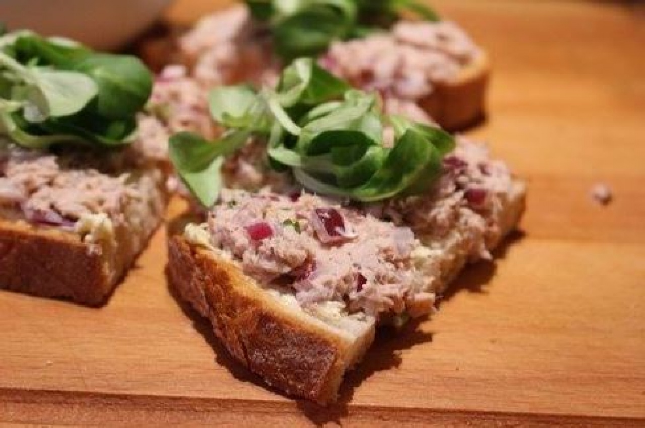 Készítsen majonézes, lila hagymás tonhalkrémet!Hozzávalók: 2 doboz tonhalkonzerv, 1 nagyobb fej lila hagyma, fél citrom, petrezselyem, majonéz, bors és pirítósok.