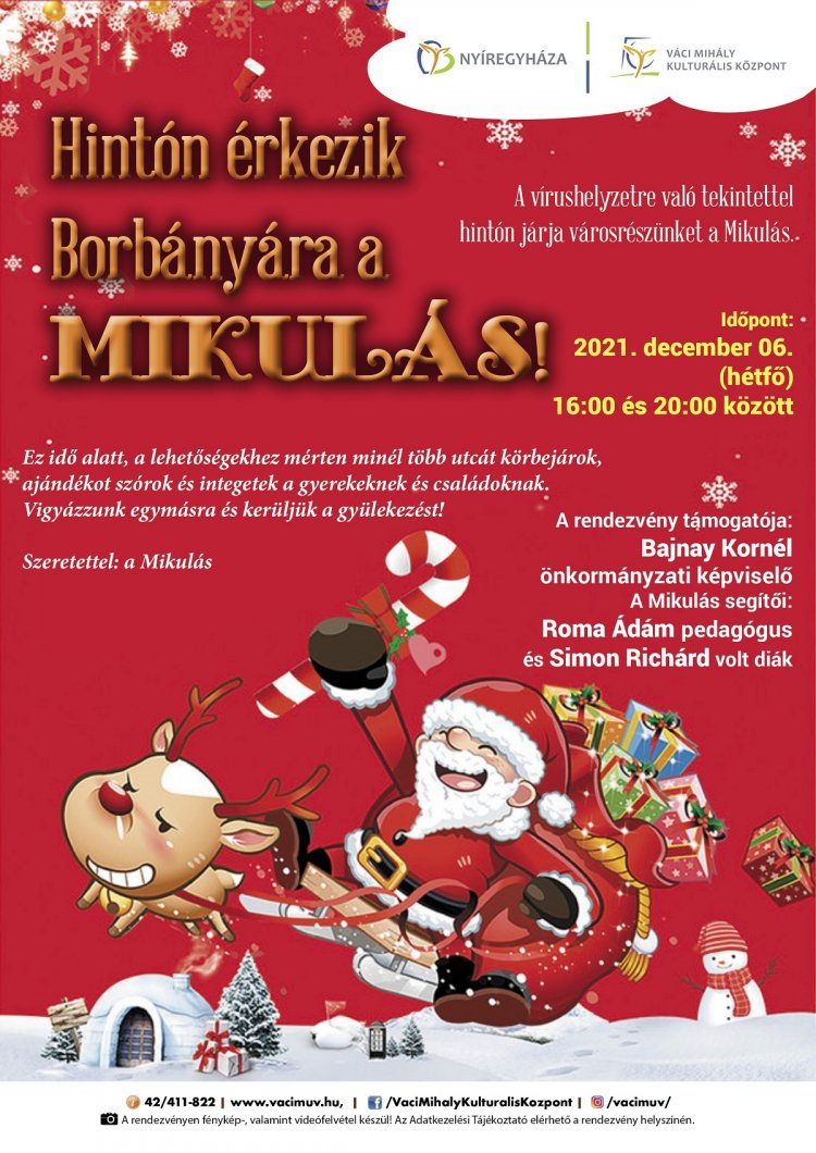 A vírushelyzetre való tekintettel hintóval érkezik Borbányára a Mikulás, december 6-án. A Télapó és segítői 16 és 20 óra között járják a városrész utcáit, ajándékot szórva a gyerekeknek.
