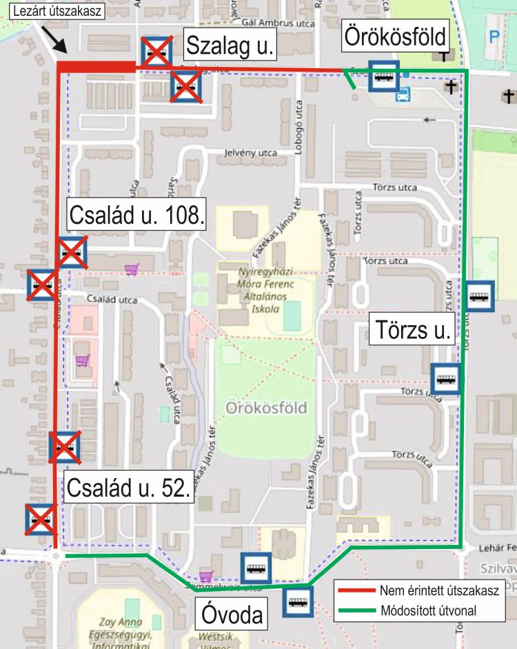 A járatok a Család utca 52., a Család utca 108., és a Szalag utca elnevezésű megállóhelyet nem érintik, helyette az Örökösföld végállomáson, illetve a Törzs utca és az Óvoda megállóhelyeken lehet fel- és leszállni.
