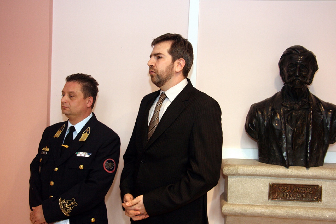 (Fotó: Mohácsi Endre ( jobbról) Sille Árpád őrnaggyal, a fegyvertörténeti kiállítás megnyitóján)