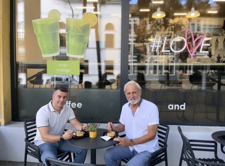 Kirják Róbert, a Móricz Zsigmond Színház igazgatója és Trokán Péter, a VIDOR Fesztivál színházi versenyprogram zsűrijének elnöke szerda délután a színházi előadások előtt közösen ellátogattak a The Box Donutban megkóstolni 21. VIDOR Fesztivál hivatalos kockafánkját.