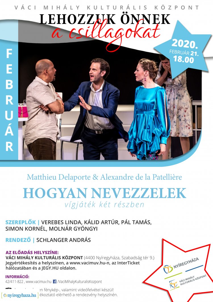 A Veres1 Színház Hogyan nevezzelek? című előadását láthatja a nyíregyházi közönség február 21-én, a Váci Mihály Kulruális Központban. A történet filmváltozata 2012-ben két César-díjat is besöpört, a komoly kérdéseket is feszegető vígjáték az egyik legsikeresebb francia film lett.