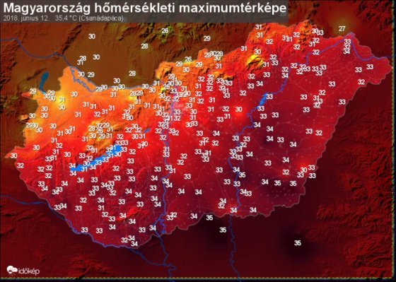 Maximum-hőmérsékletek a nyár eddigi legmelegebb napján, június 12-én.