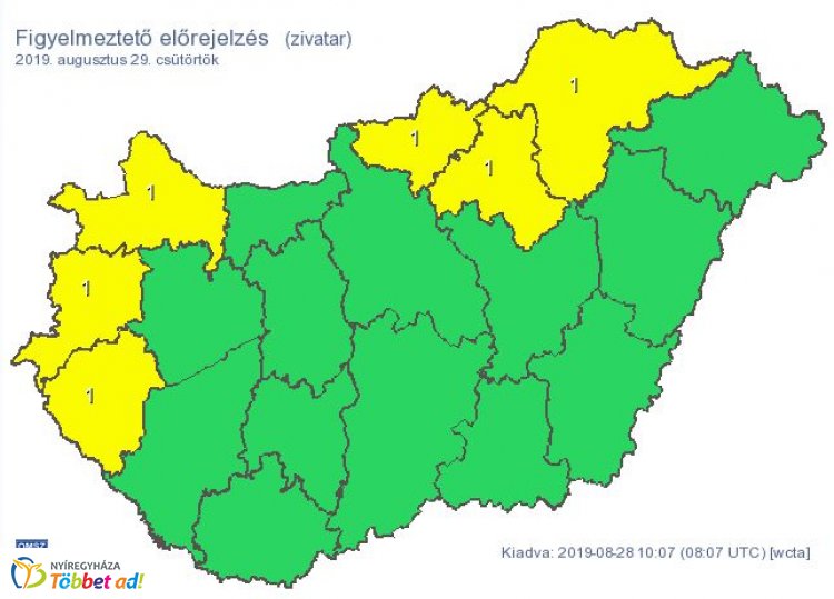Emellett Borsod-Abaúj-Zemplén, Győr-Moson-Sopron, Heves, Nógrád, Vas és Zala megyére a zivatarveszély miatt ugyancsak elsőfokú figyelmeztetést adtak ki.