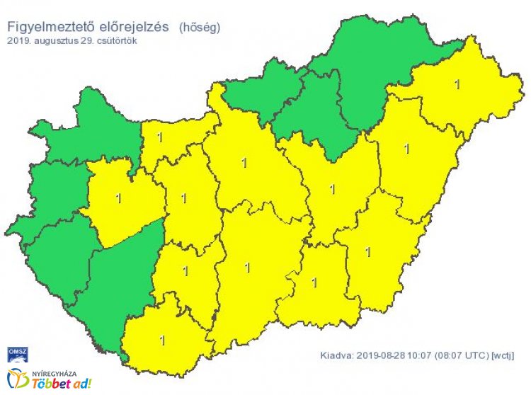 Szerdán az MTI-hez eljuttatott veszélyjelzés szerint Budapestre, Pest, Baranya, Bács-Kiskun, Békés, Csongrád, Fejér, Hajdú-Bihar, Jász-Nagykun-Szolnok, Komárom-Esztergom, Szabolcs-Szatmár-Bereg, Tolna és Veszprém megyére adták ki a hőség miatti elsőfokú figyelmeztetést.
