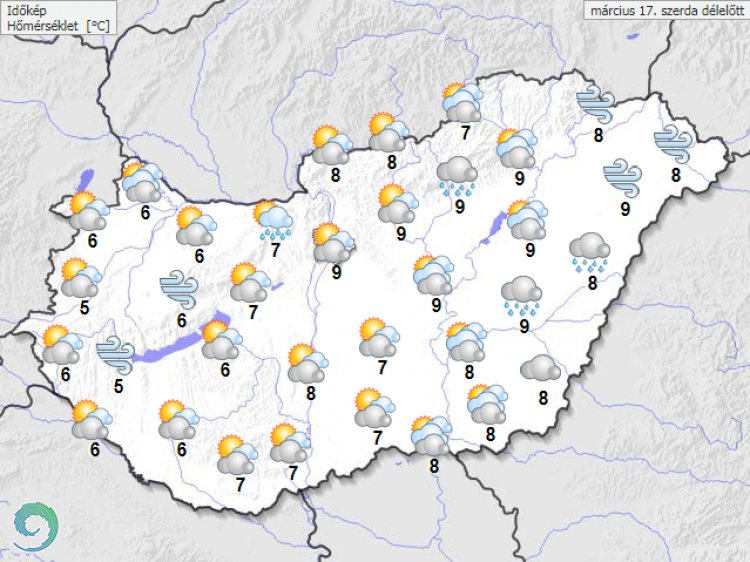 Elszórtan alakulhat ki zápor, a hegyekben hózápor. Napközben az összefüggő felhőzet határvonala lassan nyugat felé tolódik, estére a Duna vonalát is elérheti. Az északnyugati, északi szelet erős, a Dunántúlon és a Zemplén környezetében viharos lökések kísérik. A legmagasabb nappali hőmérséklet 6 és 11 fok között valószínű. Késő estére 0 és +5 fok közé hűl le a levegő.