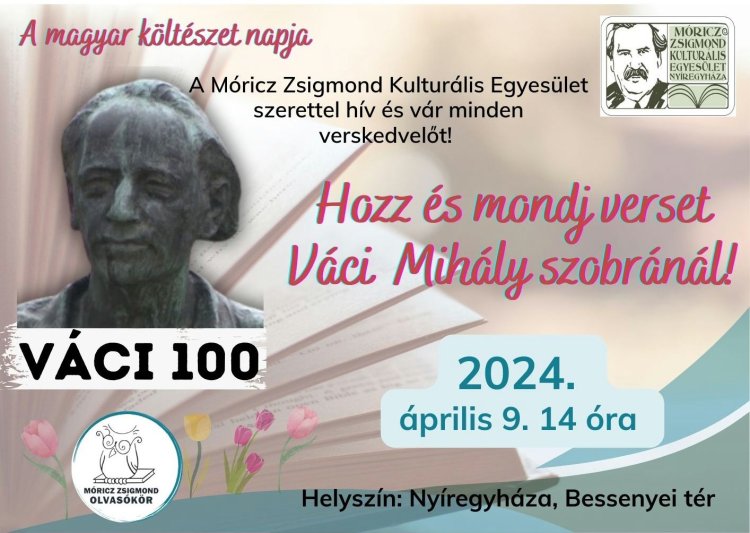 A Móricz Zsigmond Kulturális Egyesület Olvasóköre a magyar költészet napja alkalmából - Váci Mihály születésének 100 éves jubileumához kapcsolódva - Hozz és mondj verset Váci szobránál! című szabadtéri rendezvényét 2024. április 9-én ( kedden) 14 órakor rendezik meg a Bessenyei téri Váci - szobornál.