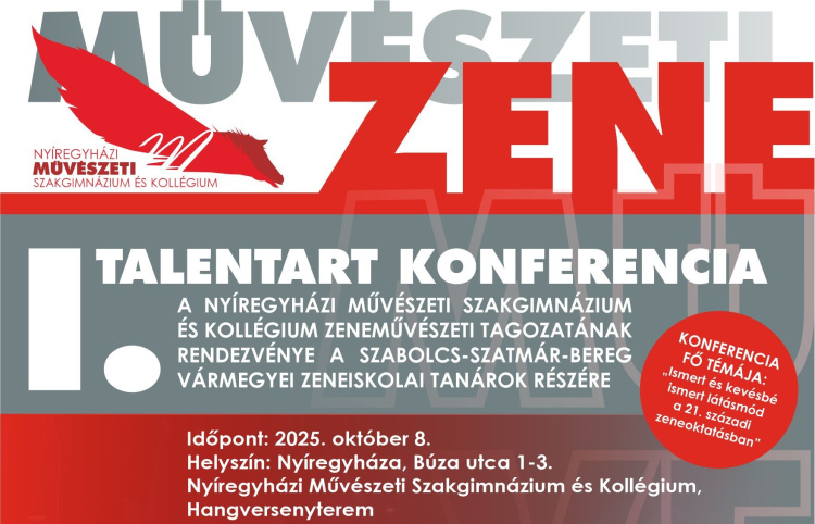 Első alkalommal rendez TalentArt Konferenciát a Nyíregyházi Művészeti Szakgimnázium és Kollégium Zeneművészeti Tagozata. Október 8-án a Szabolcs-Szatmár-Bereg vármegyei zeneiskolai tanárok oszthatják meg egymással tapasztalataikat és jó gyakorlataikat elősegítve ezzel a szakmai együttműködést, és a közösség erősítését.