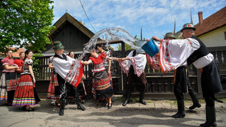 A győri Marcal Tánc és Népművészeti Egyesület tagjai népviseletben, kölni helyett vízzel locsolták a lányokat, amivel nem spóroltak. A lányok szó szerint bőrig áztak.