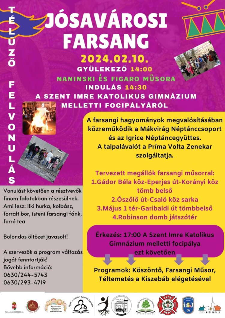 Szombat délután fél háromkor élő zenével, néptáncosokkal és különböző zajkeltő eszközökkel vonulnak át a Jósavároson a farsangi rendezvény résztvevői. A télűző menethez bárki csatlakozhat, a szervezők csupán azt kérik, hogy valamilyen álarcban vagy jelmezben érkezzenek a helyszínre. Az idén is hasonló programra készülhetnek az itt lakók és az érdeklődők a most még csendes Jósavárosban. Ahogy azt Nagy Szabina önkormányzati képviselő elmondta, 2022-ben először szerveztek farsangi felvonulást, amely egyedülálló rendezvény volt, mivel korábban még nem volt hasonló kezdeményezés a környéken.