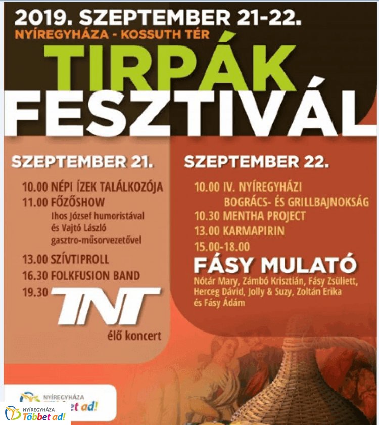 A Tirpák Fesztivált szeptember 22-én, vasárnap a IV. Nyíregyházi Bogrács- és Grillbajnokság egészíti ki. Délelőtt zenél a Mentha Project, délután a Karmapirin, majd 15 és 18 óra között érkezik a Fásy Mulató, olyan művészekkel, mint Nótár Mary, Zámbó Krisztián, Fásy Zsüliett, Herceg Dávid, Jolly & Suzy, Zoltán Erika, valamint Fásy Ádám.