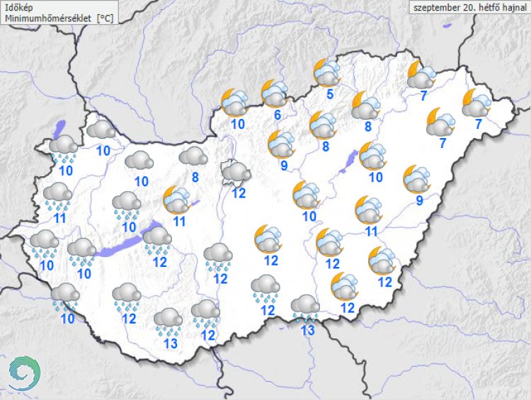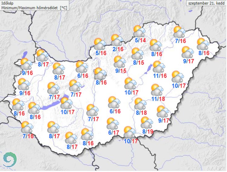 Szerdán hajnalban is előfordulhatnak pára- és ködfoltok. Napközben északkeleten, keleten néhol lehet gyenge eső. A legalacsonyabb hőmérséklet általában 6 és 11 fok között alakul, de a hidegre hajlamos helyeken 4-5 fok is lehet. Délutánra 13-19 fokig melegszik fel a levegő.