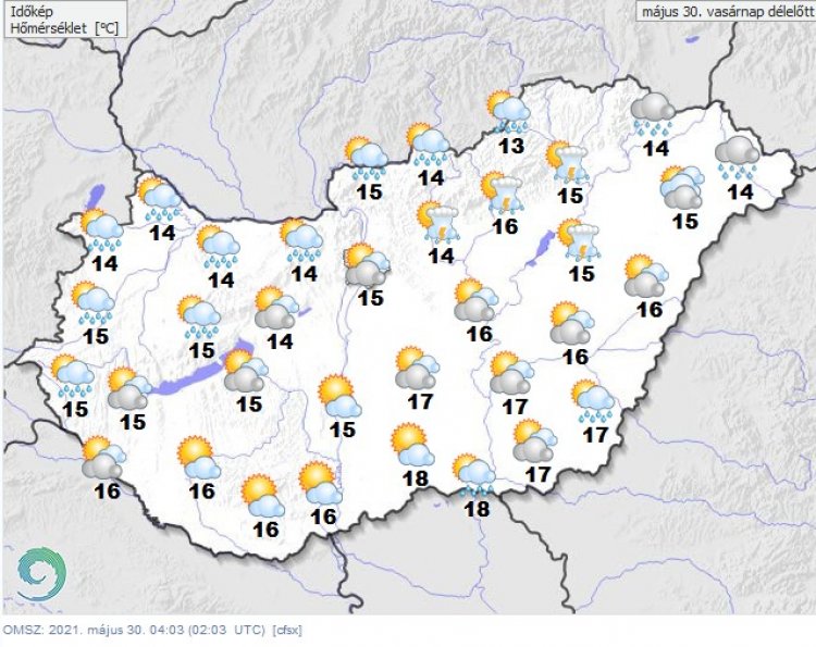 Vasárnap a sok napsütés mellett erőteljes gomolyfelhő-képződésre számíthatunk több helyen záporral, zivatarral. A gomolyfelhők északkeleten jobban összeállhatnak, és ott akár tartósabban is eshet. A zivatarokat apró szemű jég, intenzív csapadék, illetve szélerősödés kísérheti. Az északias szél megélénkül, főként a Dunántúl nyugati részén, továbbá északkeleten meg is erősödik.