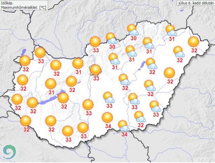 A Dunántúl nyugati részén megélénkül a déli szél, másutt gyenge marad a légmozgás. A legmagasabb nappali hőmérséklet 29 és 34 fok között várható. Késő estére 20 és 26 fok közé hűl le a levegő.
