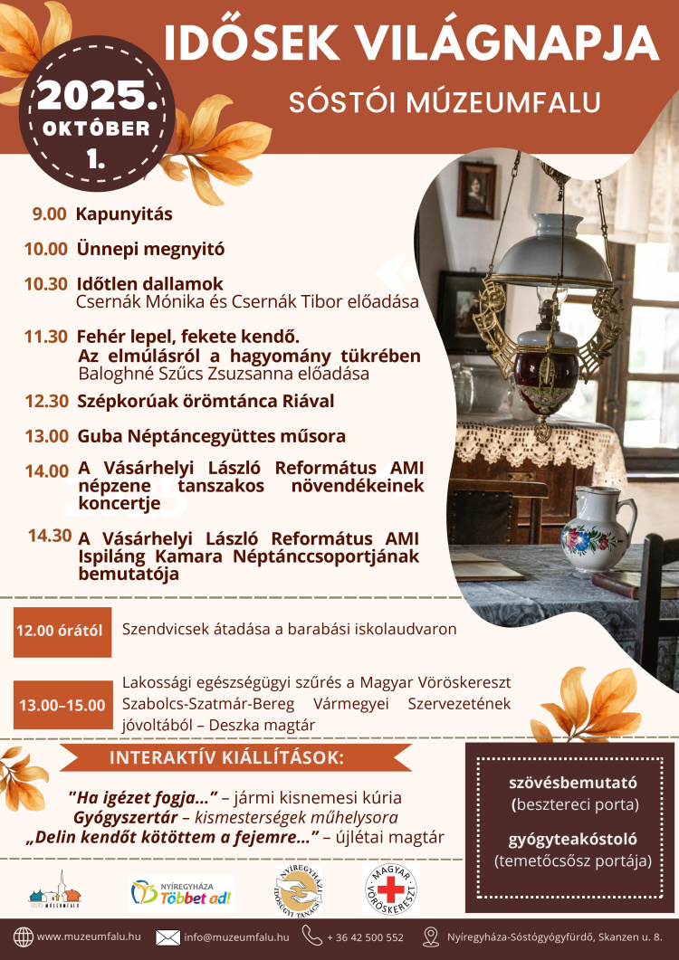 Nyíregyháza Megyei Jogú Város Önkormányzata az idei esztendőben is megrendezi az Idősek Világnapjához kapcsolódó ünnepségét október 1-jén, szerdán a Sóstói Múzeumfaluban. A szépkorúakat egész nap gazdag kulturális és szórakoztató programok várják: koncertek, hagyományőrző bemutatók, táncelőadások és különleges kísérőprogramok színesítik a rendezvényt.