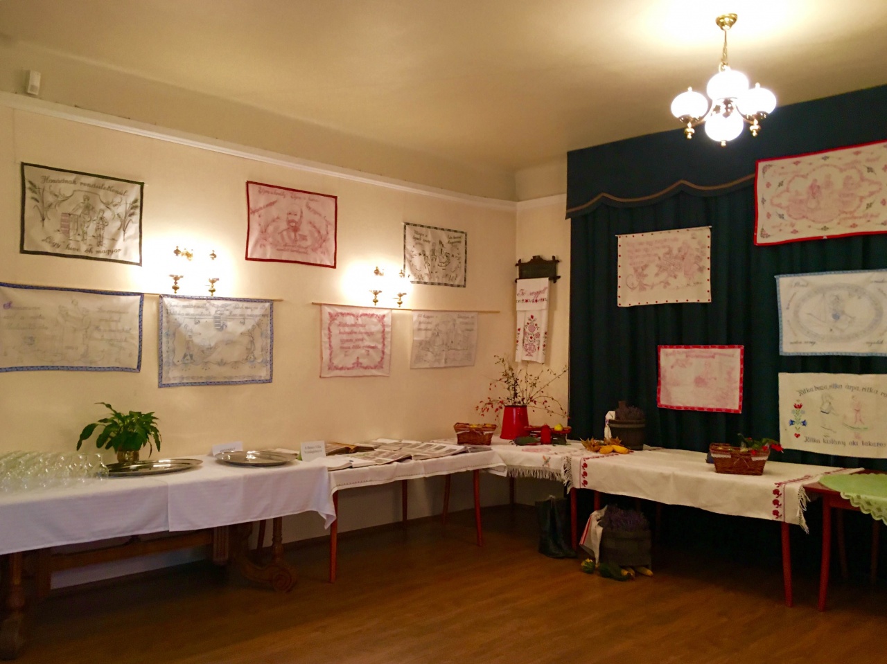 A második teremben kerültek kihelyezésre a piros és kék színű fonalból készült egyházi témával kapcsolatos alkotások; imádságos és házi áldásokat tartalmazó feliratokkal, melyek közül az egyik legszebb a következő: