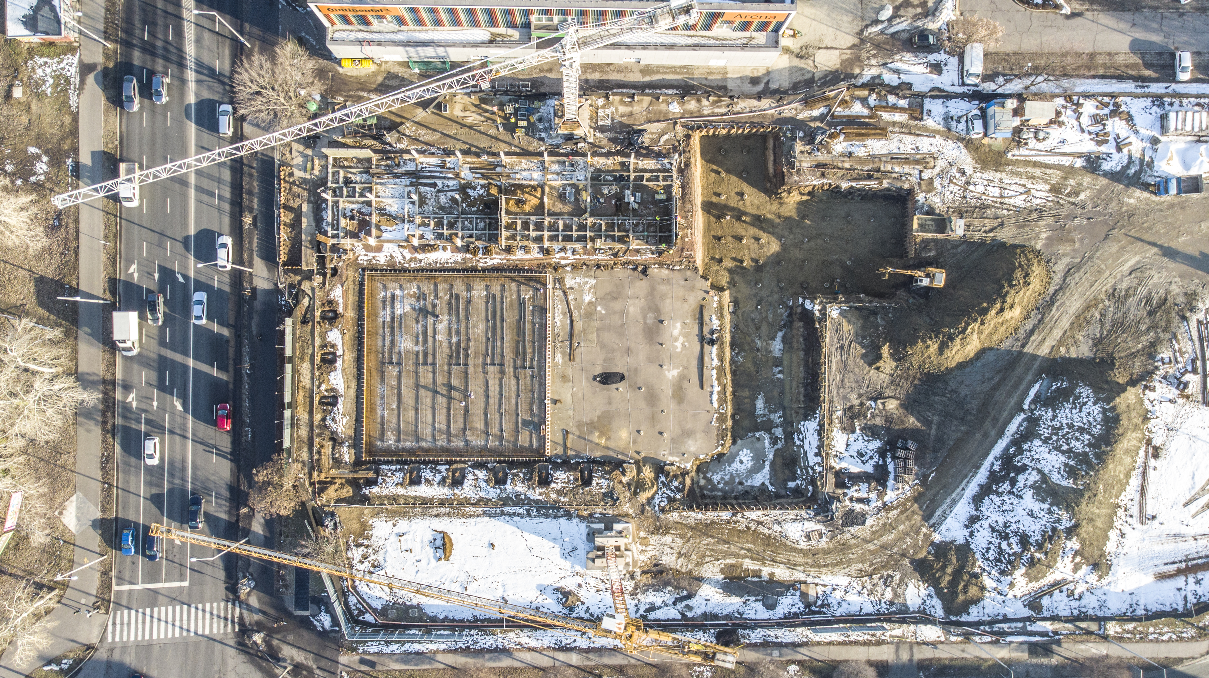 Jelenleg a betonozási folyamatok zajlanak, két toronydaru segíti a munkálatokat. Munkatársunk, Kohut Árpád a magasból örökítette meg a helyszínt.