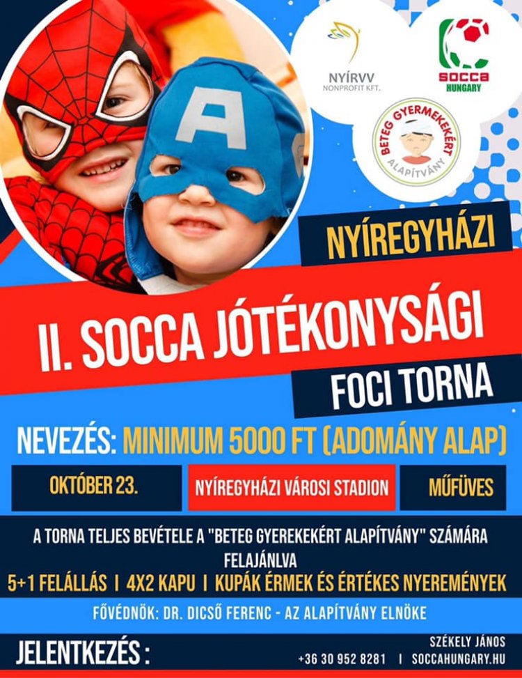 Egy éve nagy sikere volt, így október 23-án immár második alkalommal rendezik meg a Socca Jótékonysági focitornát. 20 csapat nevezett az eseményre, a jelentkezési díjakból befolyó összeget pedig a szervezők felajánlották a Beteg Gyermekekért Alapítványnak. A Socca bajnokság tavaly indult, és hétfőnként rendezik a meccseket. Nagyobb a pálya és a kapu mérete is.