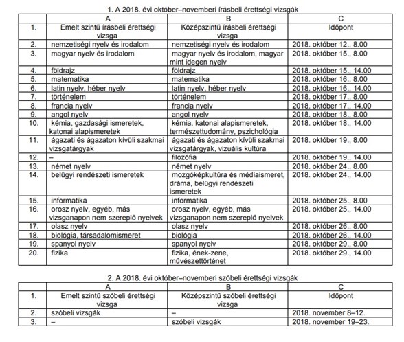 Az őszi írásbeli érettségik 2018. október 12-én kezdődnek a nemzetiségi nyelvi és irodalmi vizsgával, és a fizikával zárulnak, 2018. október 29-én. Az őszi érettségi időszak szóbeli vizsgái emelt szinten 2018. november 8-tól 12-ig tartanak majd, középszintű szóbeli vizsgák pedig 2018. november 19-től 23-ig.