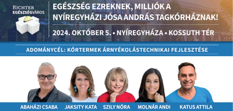 Október 5-én a nyíregyházi Kossuth téren az egészségé lesz a főszerep, ugyanis a településre érkezik a Richter Egészségváros az önkormányzattal partnerségben. A Richter Gedeon Nyrt. egészségmegőrzést és prevenciót támogató rendezvénysorozata több mint egy évtizede járja az országot ingyenes egészségügyi szűrésekkel, tanácsadásokkal és előadásokkal, hogy támogassa a hazai egészségügyi ellátórendszert.