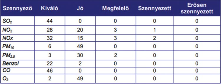 A mérőállomások által mért adatokat az éves átlagértékek alapján, a légszennyezettségi index táblázat szerint értékelhetjük. Ezek alapján az ország területén a légszennyezettség az alábbiak szerint alakult: