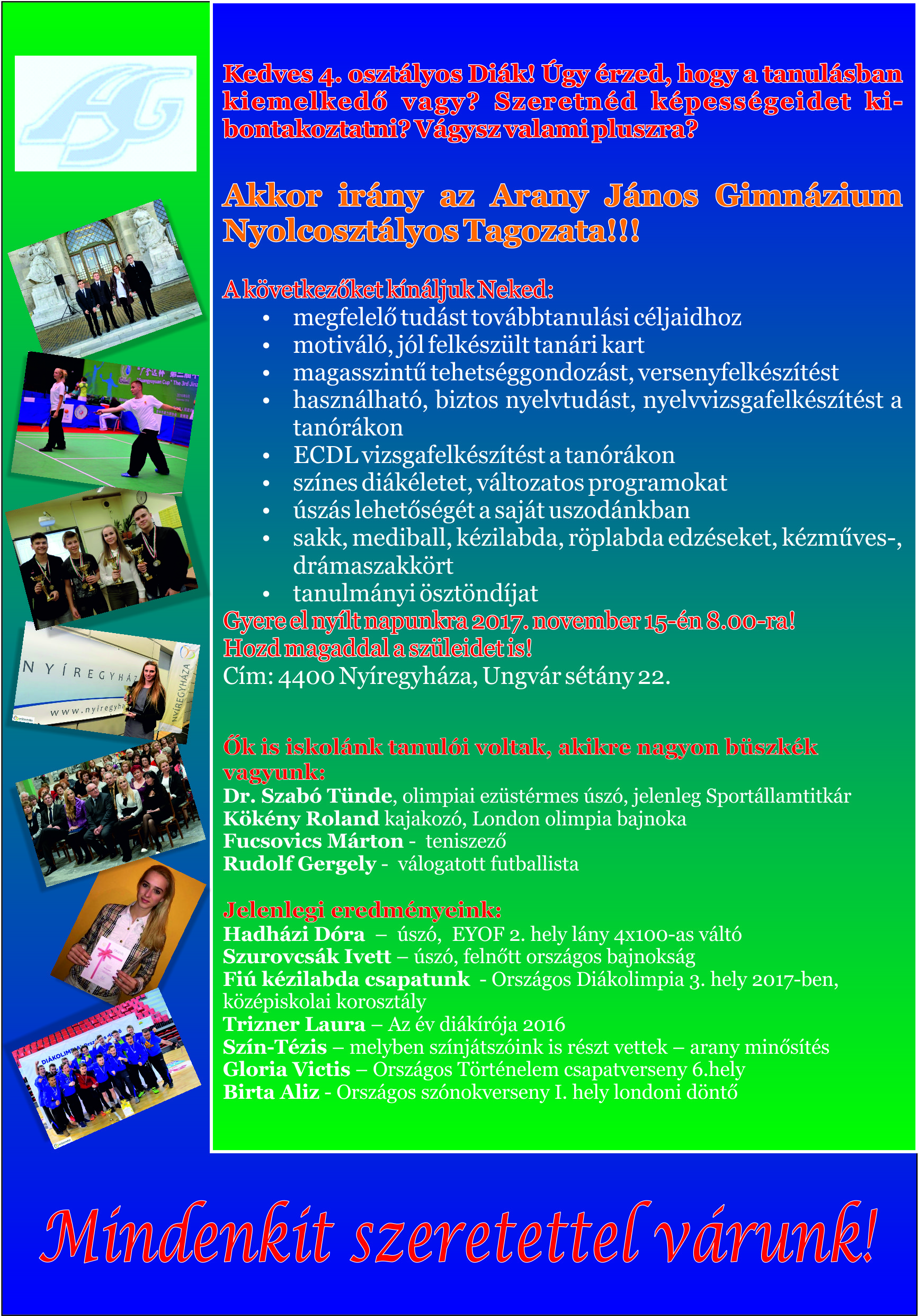 Nyolcosztályos képzésünkre várunk minden olyan tanulót, aki a 2017/18-as tanévben negyedikes. Iskolánkban megfelelő tudást biztosítunk az ambícióval rendelkező tanulóknak a továbbtanuláshoz. Erről motivált, jól felkészült pedagógusaink gondoskodnak. Tanulóinkat nem csak az érettségire, hanem különböző versenyekre is felkészítjük, használható és biztos nyelvtudást adunk nekik. Lehetőség van az ECDL vizsgafelkészítésre iskolai keretek között. Mindezek mellett az Aranyban színes a diákélet, a szabadidőt pedig szükség esetén szervezett keretek között, hasznosan tudják eltölteni a diákok.