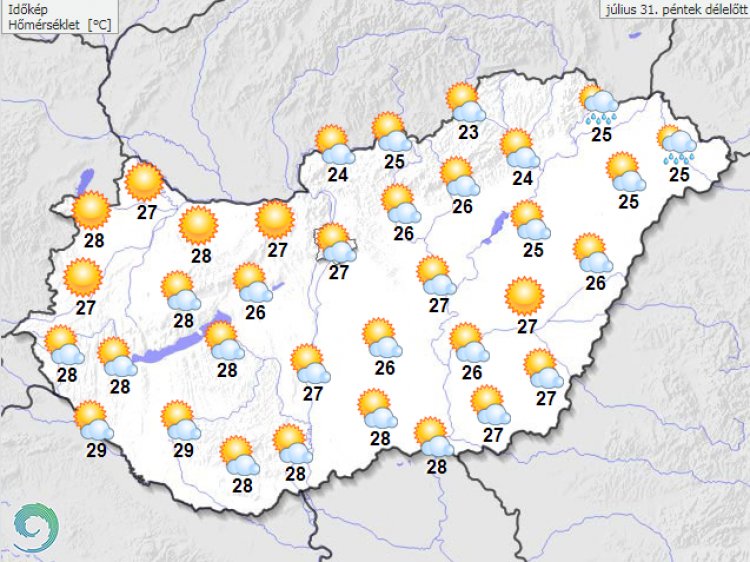 A legmagasabb nappali hőmérséklet 28 és 35 fok között várható, de egy-egy helyen 36 fok sem kizárt. Késő estére általában 20 és 26 fok közé hűl le a levegő.