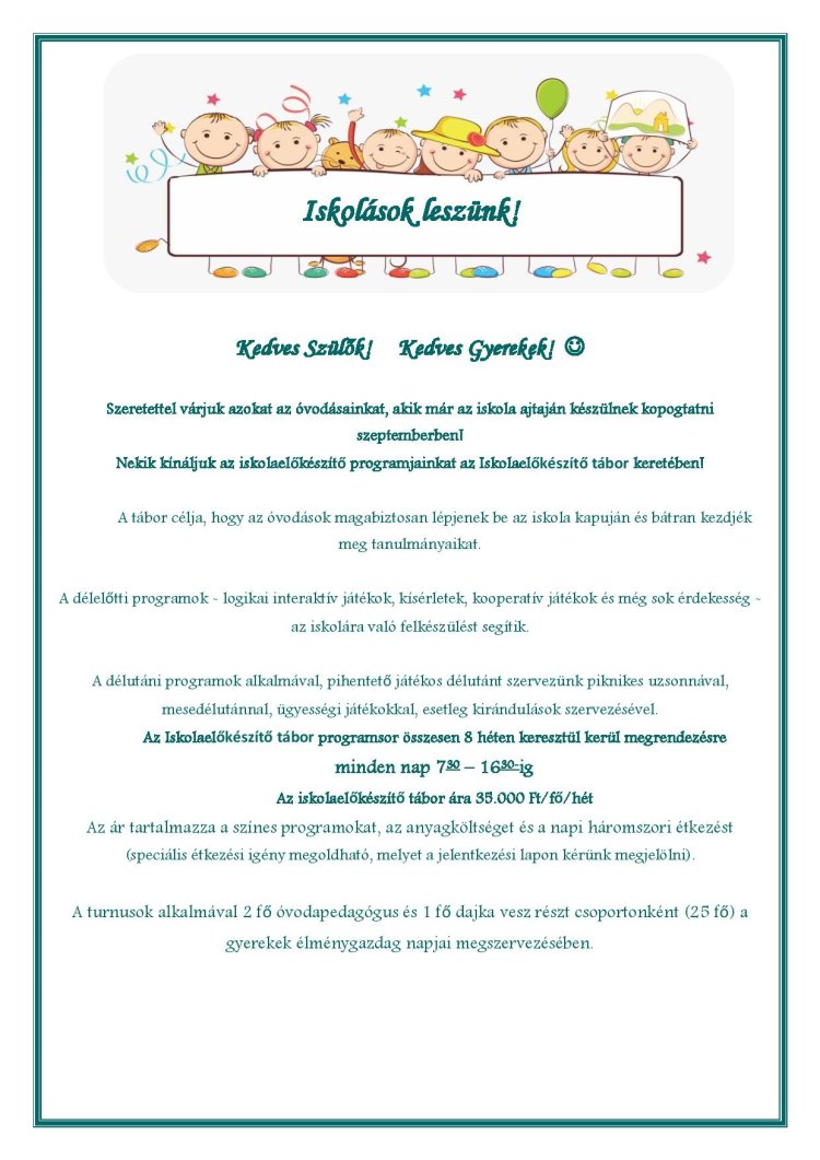 A tábor célja, hogy az óvodások magabiztosan lépjenek be az iskola kapuján és bátran kezdjék meg tanulmányaikat.