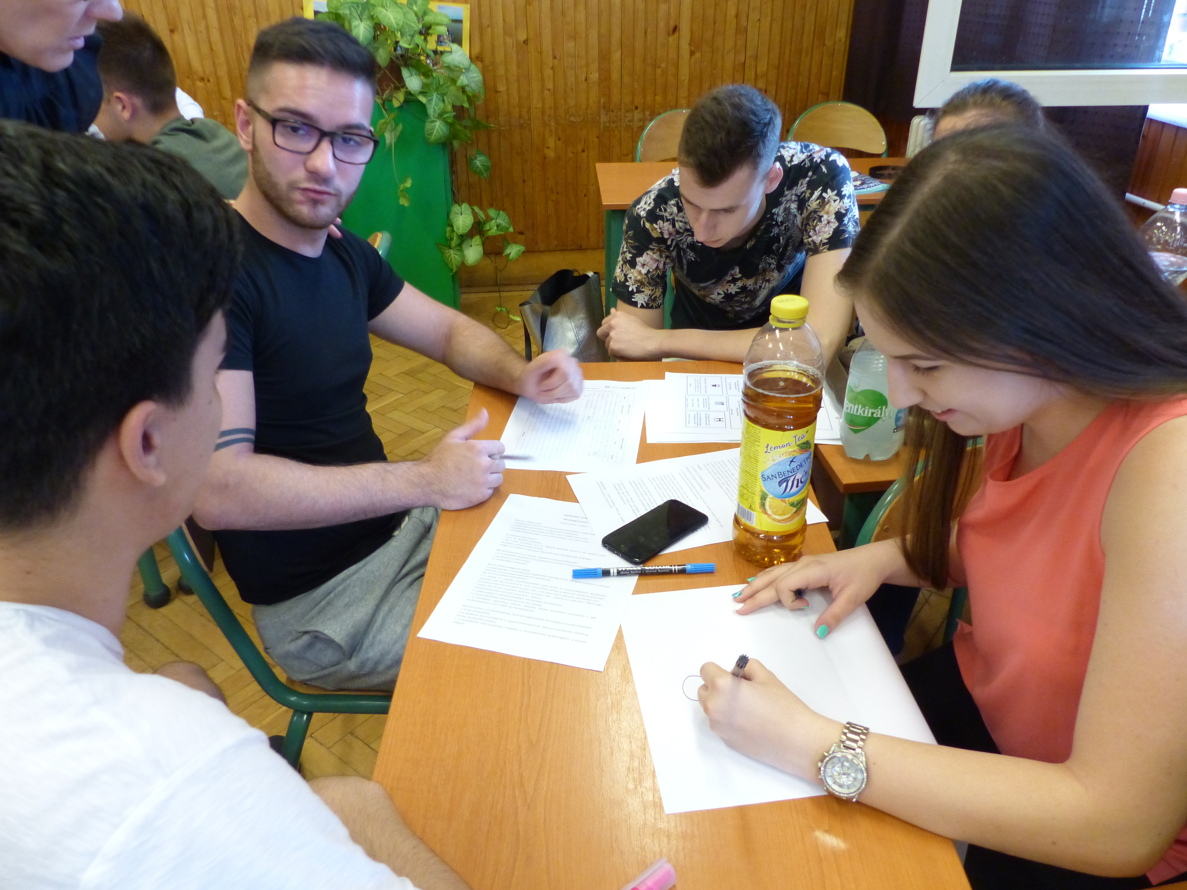 Minden csoport egy való életből merített szituációt kapott, amiről el kellett készítenünk egy pontos pénzügyi tervezetet, költségvetést. Hozzánk hasonló korú diákokról volt szó, akiknek céljai eléréséhez pénzre volt szükségük. Plakátot is készítettünk, aminek kreatívan kellett ábrázolnia a probléma megoldását, akár még a költségvetés adatait is. Erre a feladatra 25 percet kaptunk és megfelelő csapatmunkával sikerült befejeznünk időben. Ezt követően minden csoport bemutatta, hogy alanyuk milyen pénzügyi problémával nézett szembe és ezt hogyan sikerült a pénz megfelelő beosztásával, megkeresésével megoldani. Miután mindenki előadását meghallgattuk egy kvíz következett. Minden csoport kapott 100 fabatkát és ebből az összegből tettük fel tétjeinket a szerintünk megfelelő válaszra. Ha jól válaszoltunk, pénzünk megduplázódott, ha viszont rosszul, feltett pénzünk elveszett. A játék végén a jutalom sem maradt el: tollat és csoki Eurót is kaptunk.