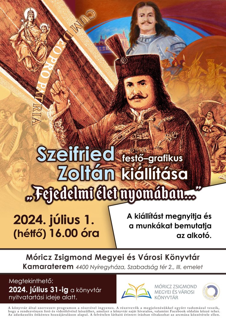 A fejedelem élete nyomában Szeifried Zoltán festőművész kiállítása nyílik meg július 1-én 16.00-től a Móricz Zsigmond Megyei és Városi Könyvtár Kamaretermében. A kiállítást maga az alkotó nyitja meg.