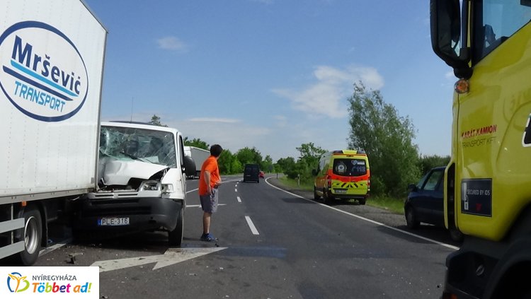Délelőtt a 4-es főúton Nyírtura közelében egy teherautó forgalmi okból fékezett, a mögötte érkező autószállító tréler pedig nekiment. A mentők egy sérültet szállítottak kórházba.