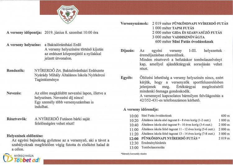 2019. június 8-án, szombaton 10.00 órától a Baktalórántházi Erdőben öt különböző hosszúságú távon mérhetik össze gyorsaságukat a résztvevők. Az ovisoknak 600 métert, az általános iskolásoknak pedig - korosztálytól függően - 1000 és 3000 méter közötti távot kell teljesíteniük. A 2019 méteres NYÍRERDŐ Futáson bárki elindulhat. A résztvevők között különféle ajándéktárgyakat, sporteszközöket sorsolnak ki a szervezők.