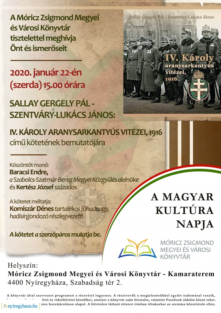 A Sallai Gergely Pál - Szentváry-Lukács János szerzőpáros mutatja be IV. Károly aranysarkantyús vitézei, 1916 című kötetét január 22-én Nyíregyházán, a Móricz Zsigmond könyvtárban.