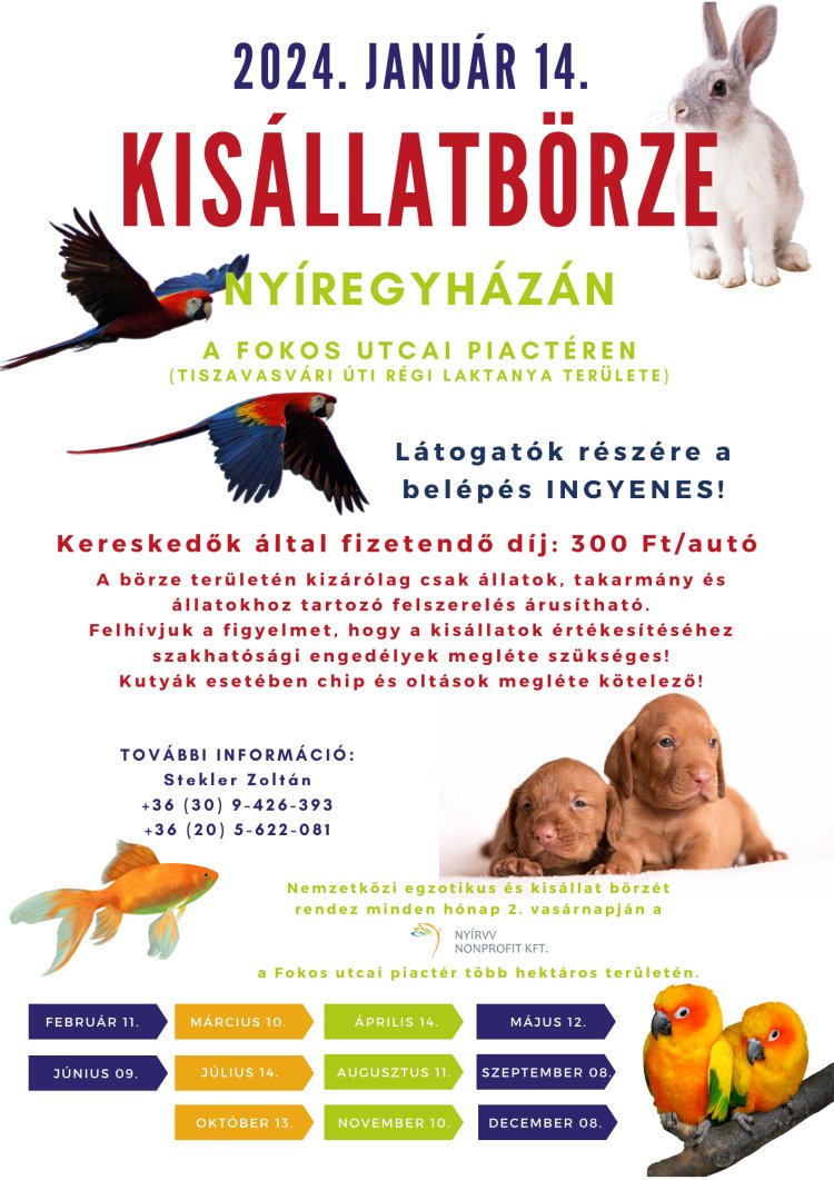 Az idei első Kisállatbörzét 2024. január 14-én szervezi meg a NYÍRVV. Minden hónap második vasárnapján 6 és 14 óra között várja az érdeklődőket a KISÁLLATBÖRZE Nyíregyházán, a Fokos utcai Piactéren.