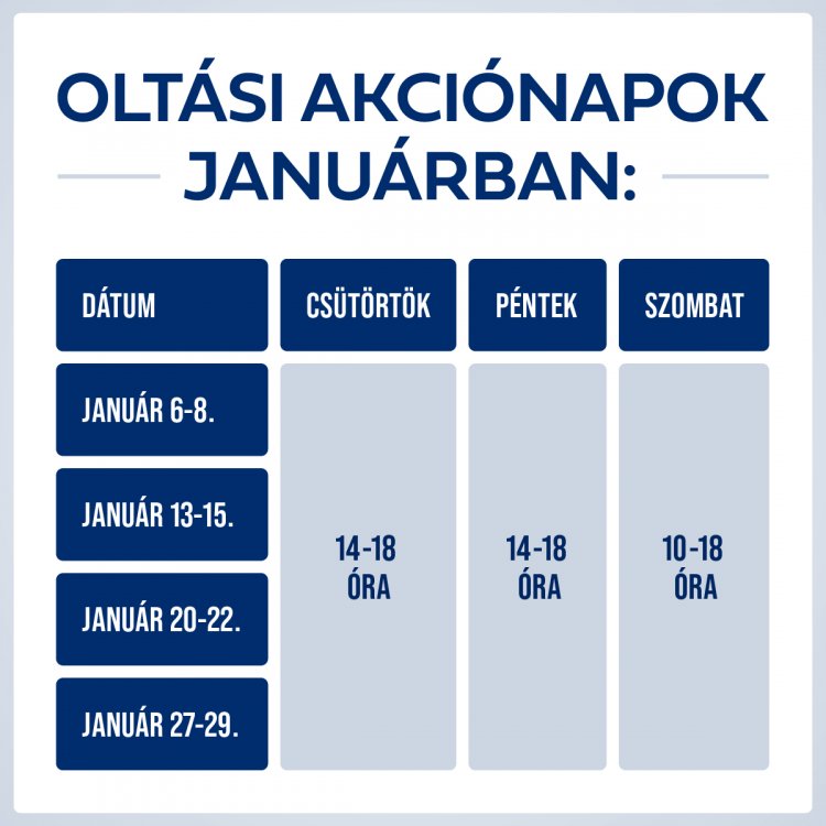 Az átoltottság további növelése és a járvány újabb hullámának megfékezése érdekében januárban minden csütörtök és péntek délután, és szombaton lesz oltási akció a kórházi oltópontokon és a kijelölt járásközponti szakrendelőkben, emellett a háziorvosok is szerveznek oltási akciónapokat.