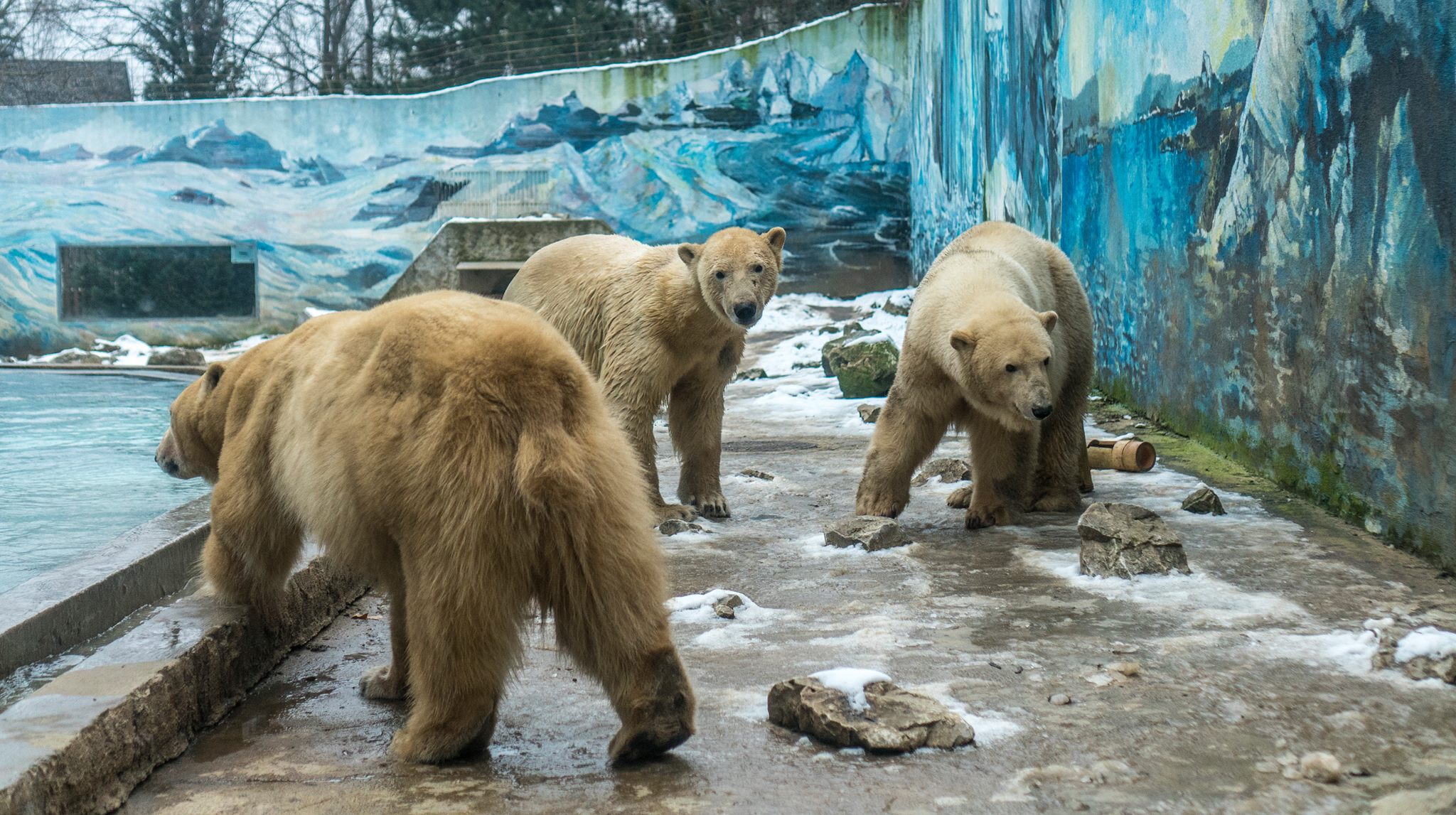 A szabolcsi megyeszékhely állatparkjában három jegesmedve él – egy hím és egy idősebb nőstény mellé került decemberben egy 3 éves, ivarérett jegesmedvelány. A csapat láthatóan élvezi a januári időjárást, hétvégén medencéjükben játszottak hatalmasat.